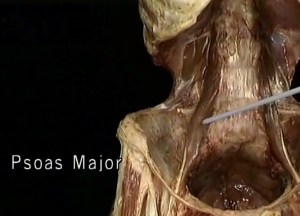 El psoas es un músculo bilateral muy potente, situado en la pared abdominal profunda y el principal conector entre el torso y las extremidades inferiores. Está dividido en dos porciones: Psoas Mayor y Psoas menor: el mayor, tiene un recorrido con origen desde la vértebra D12 hasta la 5ª vértebra lumbar (cuerpos anteriores, discos y apófisis transversas), después pasa por delante de la articulación sacroilíaca y finalmente se inserta en el trocánter menor del fémur, junto con el músculo ilíaco; el menor, tiene origen en la vértebra D12 hasta las dos primeras vértebras lumbares y se inserta en la línea pectínea. Ya que éste último está ausente en un alto porcentaje de la gente, hablaremos del psoas mayor principalmente refiriéndonos a él como psoas.