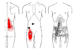 El dolor que suele producir el músculo psoas suele localizarse de forma longitudinal en la columna lumbar y/o en la parte anterior del muslo. Esto tiene sentido dado el recorrido del psoas. Además podremos encontrar puntos gatillo profundos tanto en su origen como su inserción.
