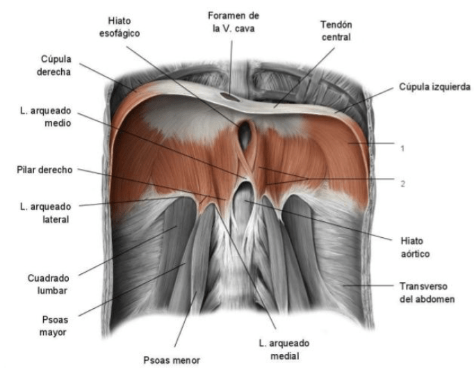 Se relaciona con el diafragma a través tanto de la fascia del psoas como del ligamento arqueado medial, que es la inserción lumbar del diafragma y a su vez el engrosamiento del músculo psoas mayor. Estos dos músculos juntos tienen un papel muy importante en la estabilización de la columna lumbar así como en la organización de las vísceras abdominales. [2,5]