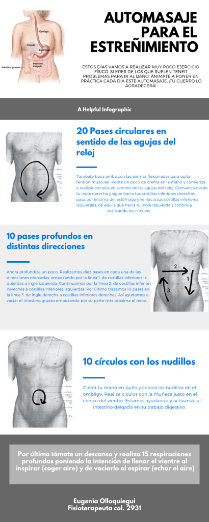 Durante estos días nuestro ejercicio físico va a ser limitado. Eso podrá traer consigo una reducción del tránsito intestinal debido a la falta de movilidad. Por eso, os propongo un auto-masaje con 3 sencillos pasos para ayudar a nuestro: