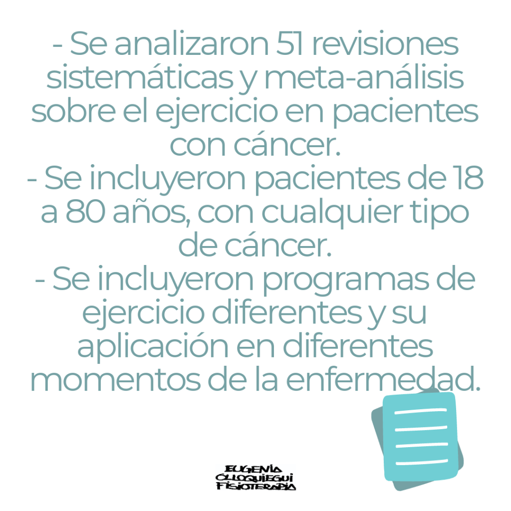 Los participantes de los estudios eran adultos de entre 18 y 80 años, sin hacer exclusión de ningún tipo de cáncer, excepto los cánceres muy avanzados o pacientes que recibían tratamiento paliativo. Las intervenciones incluían ejercicio y sus múltiples variantes como pueden ser ejercicio terapéutico, fisioterapia, entrenamiento de resistencia, entrenamiento aeróbico, rehabilitación, estiramientos… Las comparaciones de los estudios analizados fueron: intervención con ejercicio versus nada de ejercicio, ejercicio supervisado versus no-supervisado, variables en la frecuencia de ejercicio, variables en la duración de ejercicio y comparación entre distintos tipos de ejercicio. Los resultados incluyeron beneficios tanto funcionales como neuromusculoesqueléticos y cardiometabólicos, mejoría de la capacidad física, mejoras en las medidas funcionales, mejoría de la calidad de vida en general, mejoras del flujo sanguíneo y de los biomarcadores y beneficios psicológicos y psicosociales.
