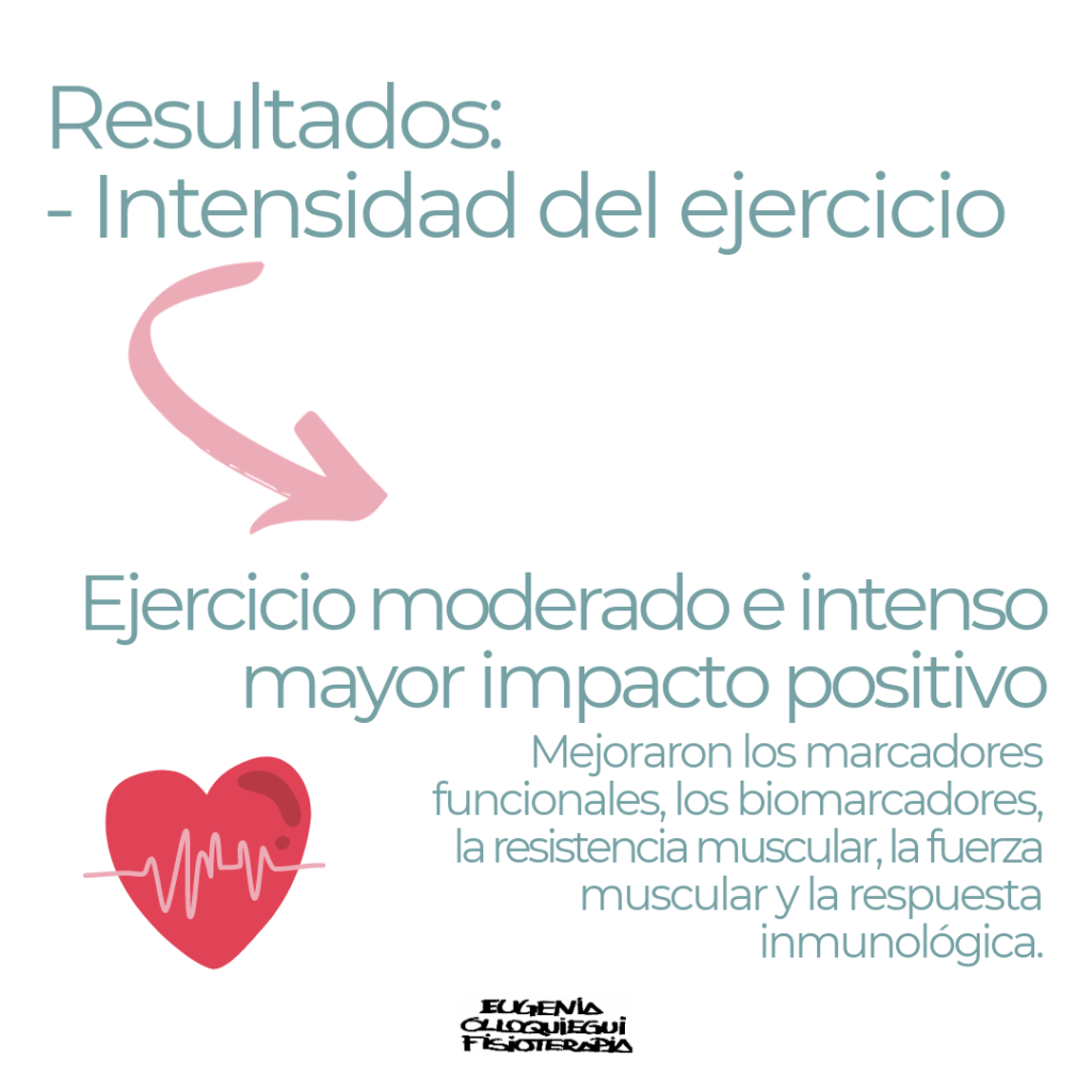 - Intensidad del ejercicio: en general, se analizó que los programas de ejercicio con intensidades moderadas y altas tenían un mayor beneficio respecto a los programas con nada de ejercicio o con ejercicio a baja intensidad. Se observaron beneficios en marcadores relacionados con la capacidad respiratoria (VO2 peak, VO2 max), en la fuerza y resistencia muscular, en valores funcionales como en los test «6 and 12 minute walking test» y en la respuesta inmunológica.