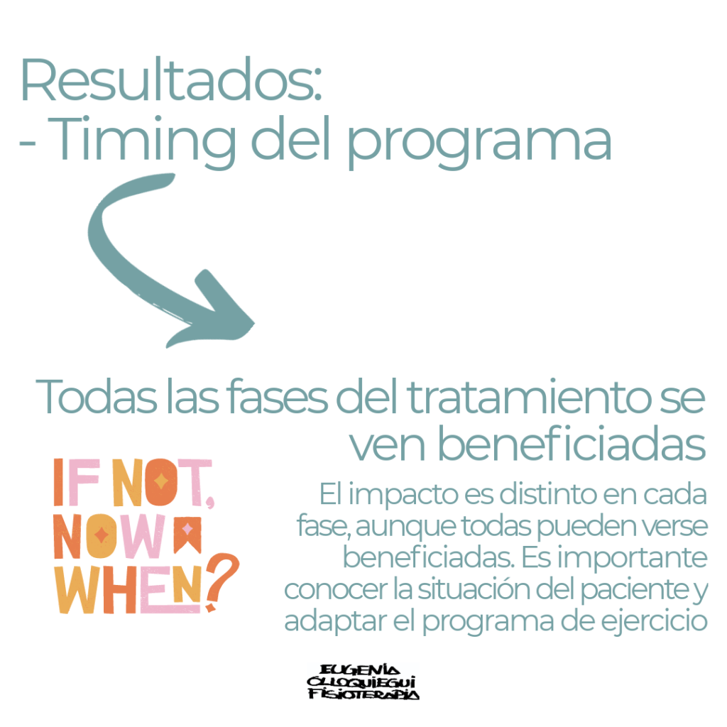 - «Timing» del ejercicio: se estudiaron las posibles variables en el tiempo: pre-tratamiento, durante el tratamiento y post-tratamiento en pacientes supervivientes. El mayor número de revisiones se encontró en las fases activa y post del tratamiento oncológico. Sugirieron que el mayor impacto en la calidad de vida, en la funcionalidad y en la fuerza muscular se observó en los programas de ejercicio una vez completado el tratamiento. Los programas de ejercicio durante el tratamiento tuvieron un gran impacto en la fatiga (principal efecto secundario del tratamiento), en la calidad del sueño, en la ansiedad, en la depresión y en la función física. El ejercicio antes de comenzar el tratamiento (pre-tratamiento) es relativamente nuevo en oncología, aunque las revisiones sistemáticas analizadas en el estudio confirman que se obtuvieron beneficios en la tolerancia de los tratamientos (sobretodo con la quimioterapia), en la adherencia a los programas de ejercicio durante y después del tratamiento, en la reducción de los tiempos de ingreso hospitalarios y mejoró la funcionalidad a la hora de recuperar las actividades de la vida diaria tras el ingreso hospitalario.