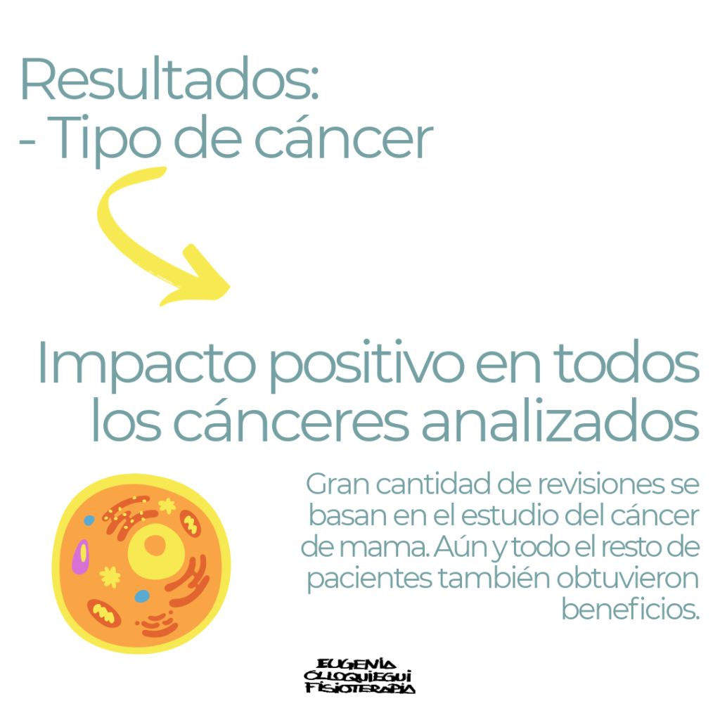 - Tipo de cáncer: la mayoría de revisiones estudiaron los beneficios en diferentes y numerosos tipos de cáncer, sin entrar a evaluar cuál puede verse más beneficiado. Se sabe que la investigación en el cáncer de mama es muy alta y se encuentran un número mayor de revisiones en este tipo de cáncer.