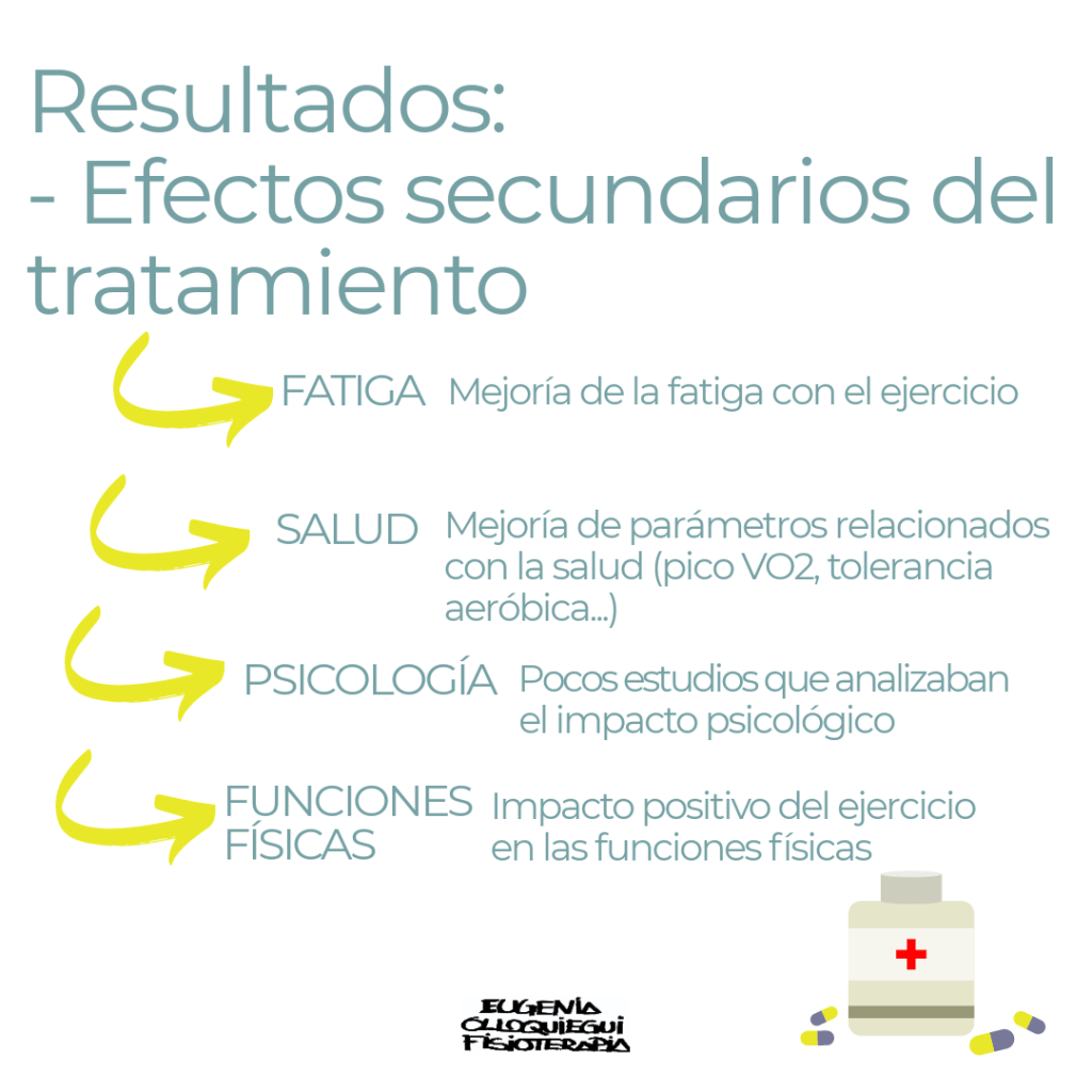 - Estado psicológico: no hay suficiente evidencia para destacar cambios por el ejercicio en el estado psicológico de los pacientes.