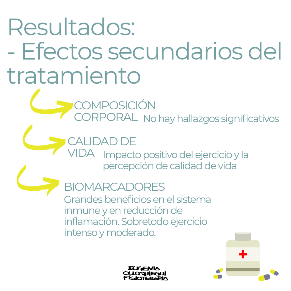 - Biomarcadores asociados a la progresión del cáncer: el ejercicio tuvo un gran impacto positivo en los biomarcadores, dando lugar a un sistema inmune más fuerte y a la reducción de los macadores de inflamación. Se observó que los programas de ejercicio intenso y moderado tenían mejores resultados en los biomarcadoes respecto a los programas de ejercicio leve.