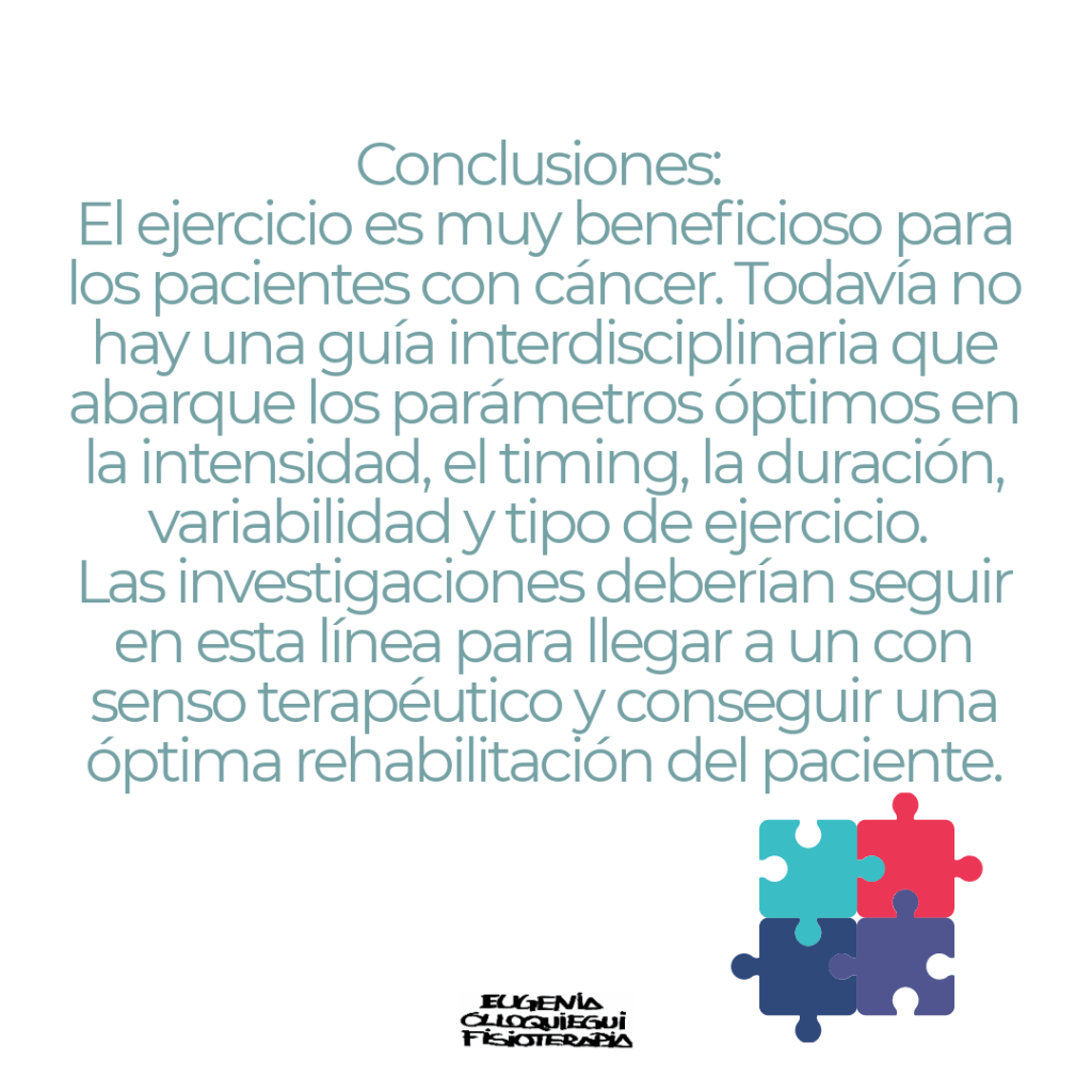 Actualmente no existen guías interdisciplinares que ofrezcan un programa óptimo con el timing, la intensidad, la duración, la frecuencia del ejercicio y la detección e intervención de ejercicio terapéutico. Por eso, los próximos estudios y análisis deberían ir encaminados en esta línea e investigar los mejores parámetros de ejercicio, en las distintas fases del tratamiento y atendiendo a los posibles efectos secundarios del tratamiento de cáncer para ofrecer así una óptima rehabilitación a este numeroso grupo de pacientes.